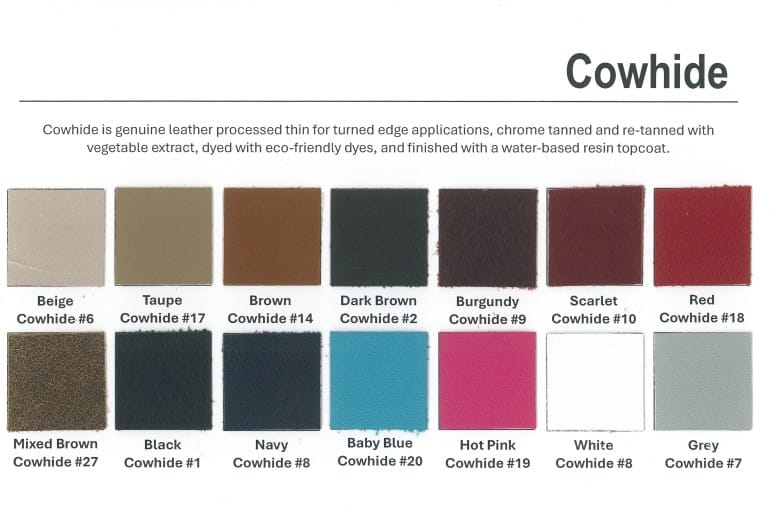 Cowhide is genuine leather that has been processed to make it thin enough for your turned edge application. It is sold by the side. The sides average approximately 20 square feet per side. There are currently 11 colours and finishes to choose from. We do not sheet the cowhide since there is always a waste factor because of the shape of the side.